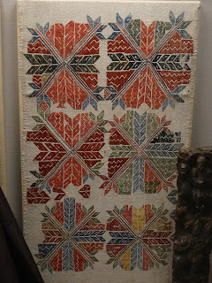 Embroidered in red with geometric designs, the bed cover is a typical example of the decorative style of Naxian needlework.